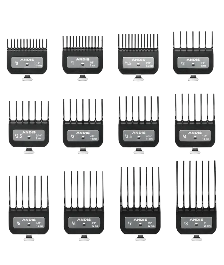 Kutuyla birlikte gelen 12 adet yeni tasarım, metal uçlu premium tarak başlığı, kesim seçeneklerinizi genişletir ve işinizi kolaylaştırır.